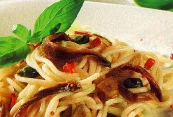 - In una padella sufficientemente capiente mettete l'olio e fatelo scaldare. Aggiungete il peperoncino, l'aglio, le acciughe e i capperi. Fateli rosolare leggermente poi unite gli spaghetti e insaporite con sale e pepe.
