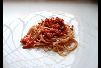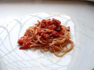rosolare l'aglio con l'olio in due padelle e far aprire separatamente cozze e vongole. In un'altra padella cuocere gamberi, seppie tagliate e salmone. A parte rosolare l'aglio con l'olio, unire la polpa di pomodoro, sale e peperoncino e far cuocere 20 minuti aggiungendo due mestoli di brodo. Unire al pomodoro tutto il pesce, cotto a parte. Lessare gli spaghetti e unire al sugo di pomodoro e pesce. Completare con prezzemolo tritato.