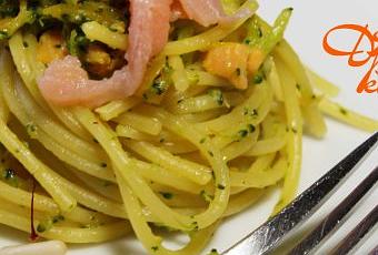 Sciogliere qualche pistillo di zafferano in acqua calda (meglio se lo fate qualche ora prima). Lavare sotto acqua corrente il broccolo, staccarne le cime e farle cuocere a vapore per una decina di minuti o fino a quando saranno belle morbide. In una padella antiaderente o meglio con fondo di ceramica, scaldare un filo di olio evo in cui soffriggere lo spicchio di aglio e qualche acciuga. Unire le cime dei broccoletti, farle saltare un po’, unire dell’acqua di cottura se necessario. Appena il tutto è ben cotto, prendere un quarto del preparato e porlo nel bicchiere del frullatore ad immersione e ridurre il tutto in purea. Regolare di sale e unirlo al resto dei broccoli, abbassare la fiamma al minimo, unire lo zafferano sciolto. Tagliare il salmone a listarelle che unirete ai broccoli tranne qualcuno per la parte finale del piatto. Unire anche i pinoli, qualcuno tenerlo da parte; regolare di pepe. Nel frattempo lessare gli spaghetti nell’acqua di cottura del broccolo, scolarli nella padella dei broccoli e mescolare energicamente facendo anche saltare un po’ il tutto. Impiattare bene il tutto, finendo con il salmone e i pinoli lasciati da parte, se volete qualche pistillo.