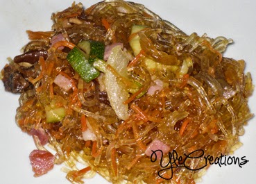 Oggi non si cucina italiano, eh no! Chi l'ha detto che è difficile preparare le ricette cinesi? Certo, magari non abbiamo la wok, o non troviamo proprio i giusti ingredienti, ma con pochi semplici prodotti di casa nostra e qualche accorgimento il gioco è fatto, per portare un tocco orientale sulla nostra tavola. Cosa vi serve? Ecco la lista. Servono 100 g di spaghettini di soia, 60 g di pancetta dolce a cubetti, 30 g di porcini secchi, brodo di manzo (o di pollo), 1/2 zucchina, 2 carote, 1/4 di cipolla, 3 cucchiai di salsa di soia, 2 cucchiaini di zucchero, 2 cucchiai di aceto di mele e olio di semi. Preparate gli spaghetti come scritto sulla confezione (di solito in acqua bollente per qualche minuto) e poi scolateli. Mettete a bagno i funghi in acqua finché non si saranno ammorbiditi e intanto in una padella versate 2 cucchiai di olio e fate rosolare la pancetta fino a quando non sarà diventata rosa. Inserite zucchina, carote e cipolla tagliate a listarelle e fate appassire. Unite poi gli spaghetti e mescolate, saltando di tanto in tanto. In una ciotola preparate il condimento con un bicchiere di brodo, la salsa di soia, zucchero, aceto e un cucchiaino di olio. Mescolate ed unite al tutto nella padella, poi saltate finché il brodo di cottura non sarà evaporato e servite il piatto caldo. Beh, non male, non vi sembra? Allora provate e fatemi sapere, ciao e un bacio!--------------------------------------------------------Today we don't cook italian, no! Who said that it's difficult to prepare chinese recipes? Sure, maybe you don't have a wok, or you can't find the right ingredients, but with some simple products we can find at home and some changes that's it, to bring an oriental touch on our tables. What do you need? Here is the list. You need 100 g of soya spaghetti, 60 g of bacon (not smoked) in cubes, 30 g of dried porcini mushrooms, beef bouillon (or chicken), 1/2 zucchini, 2 carrots, 1/4 of onion, 3 spoons of soya sauce, 2 teaspoons of sugar, 2 spoons of apples vinegar and seeds oil. Prepare the spaghetti as written on the packaging (usually in boiling water for a few minutes) and then drain them. Soak the mushrooms in water until they will be soft and meanwhile pour in a pan 2 spoons of oil and brown the bacon until it's light pink. Add zucchini, carrots and onion all cut in strips and sauté. In a bowl prepare the seasoning with a glass of bouillon, soya sauce, sugar, vinegar and a spoon of oil. Stir and add it to the pan, then cook until the bouillon has evaporated and serve the dish hot. Well, not bad, don't you think? So try and let me know, bye and a kiss!