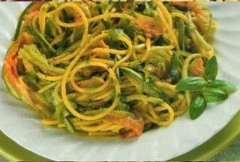 Un piatto davvero sorprendente, spaghetti con crema di avocado e zucchine, aromatizzati con zafferano, basilico, peperoncino.Facile e veloce da preparare.