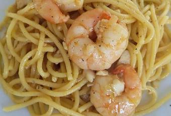 Saltare gli spaghetti lessati al dente a fuoco vivo con il fumetto, la gallinella e i gamberi.
