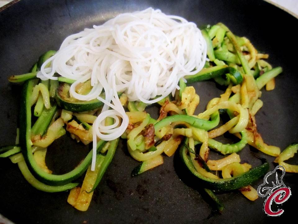 Quando l'acqua avrà raggiunto il bollore, immergete gli spaghetti di riso basmati, girate con una forchetta e procedete la cottura per il tempo indicato. Serviranno circa 12 minuti (i restanti li riserverete alla padella).