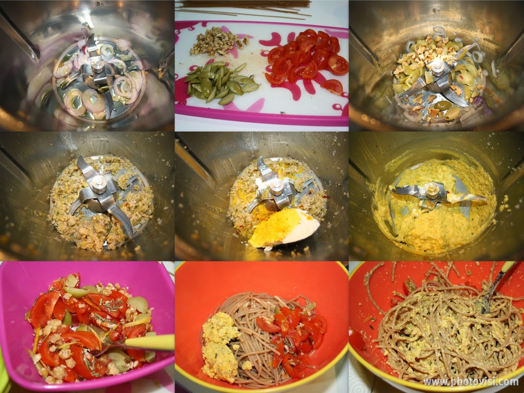 Nel frattempo ho tagliato i pomodorini, le olive e le noci e 3/4 delle ultime due (olive e noci) li ho aggiunti alla cipolla ed ho tritato il tutto per 5 sec. vel.7.