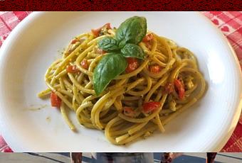 Condire gli spaghetti lessati al dente con il pesto, unire i pomodorini, mescolare e servire.