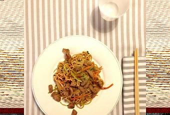Quando sarà leggermente raffreddata con un paio di fogli di carta da cucina a secco pulite la wok. Sempre su fuoco vivo fate scaldare tre cucchiai di olio d’oliva e un cucchiaio di olio di sesamo. Fate saltare dapprima lo zenzero e l’aglio con i il burro d’arachidi con il lime, unendo poi le verdure con una spruzzata di salsa di soia, sempre aiutandovi con il cucchiaio di legno per non farle attaccare. Quando le verdure staranno iniziando appena appena ad appassire aggiungete il maiale e gli spaghetti e fate saltare tutto insieme per pochissimi minuti aggiungendo alla fine una spruzzata il succo di un lime.