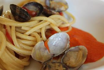 Cuocere gli spaghetti in acqua bollente fino a 3/4 della cottura, dopo di che trasferirli nell'acqua di cottura delle vongole che starà in ebollizione e finire la cottura se necessita aggiungendo un pò di acqua di cottura della pasta e un pò di olio, a cottura ultimata aggiungere le vongole, saltare e servire sopra la salsa di peperone con una spruzzata di prezzemolo.