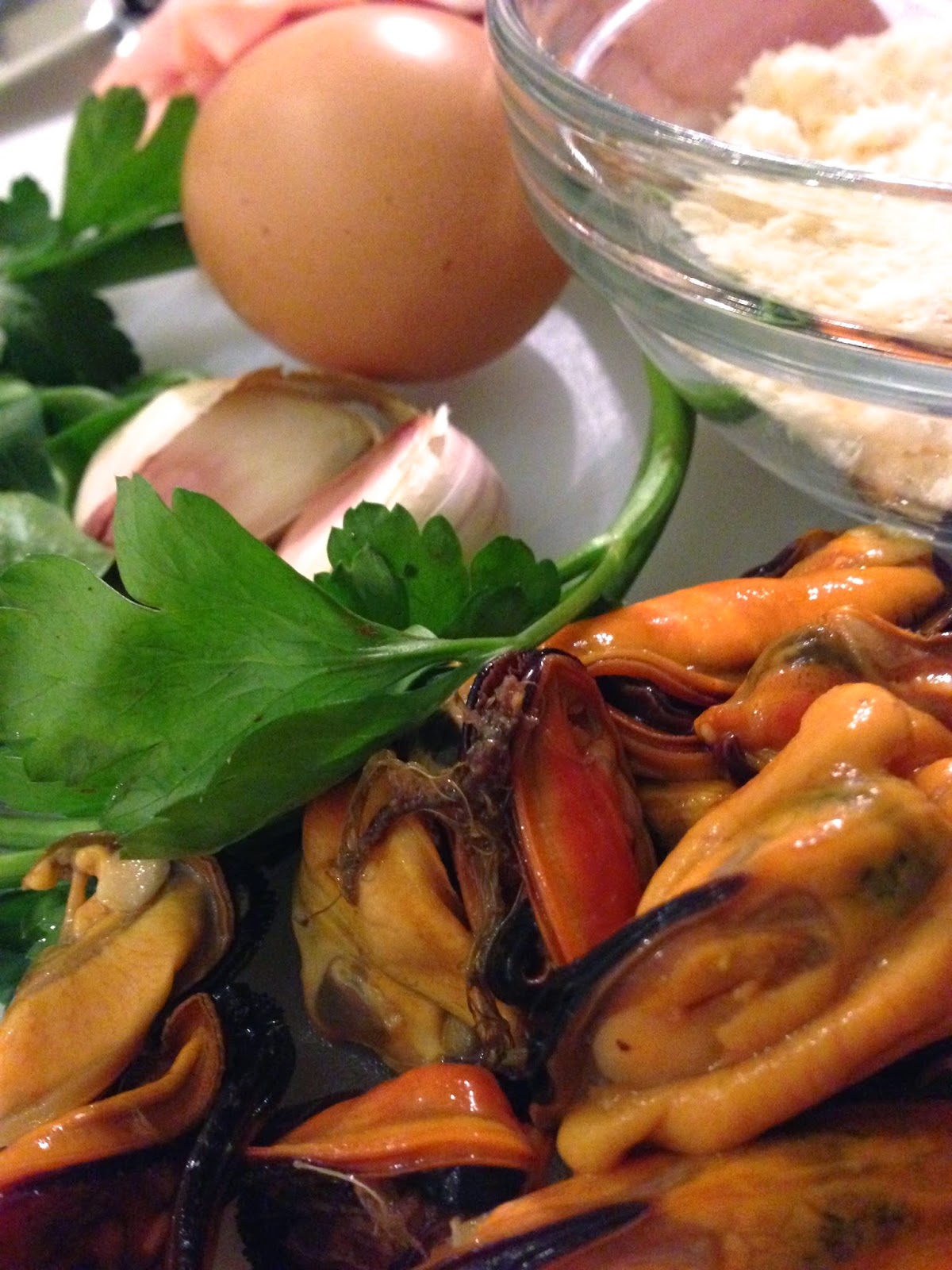 4) Chop the parsley,squeeze the garlic add to mortadella and mussels