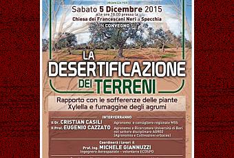 La passione e l’impegno con cui i volontari dell’associazione ECO SPO onlus di Specchia agiscono e lavorano in campo ambientale e la sensibile attenzione che pongono ai problemi del nostro territorio si confermano ancora una volta nel grande appuntamento di sabato 5 dicembre. Alle ore 18 presso il Convento dei Francescani Neri, infatti, il Gruppo Ecologico Spontaneo di Specchia organizza e firma il Convegno su “LA DESERTIFICAZIONE DEI TERRENI- Rapporto con le sofferenze delle piante.