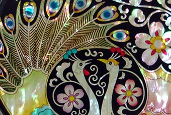 Vedi altre fotografie Questo elegante specchietto è ornato con intarsi di madreperla raffiguranti due pavoni come simbolo di matrimonio. L’intarsio elaborato e l'iridescenza della madreperla lo rendono un oggetto splendido per collezionisti. Il motivo floreale inciso sulla superficie posteriore facilita l’impugnatura e aggiunge un tocco di eleganza. Lo specchio è richiudibile e doppio, con uno specchio normale e uno ingranditore.