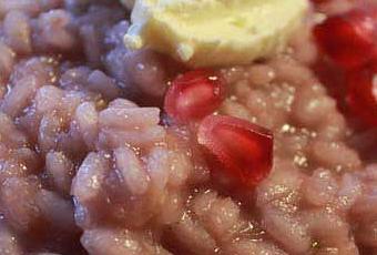 Nella stessa padella nella quale avete fatto soffriggere le cipolle, fate cuocere il riso, aiutando la cottura con del brodo vegetale. A mezza cottura aggiungete la crema di cipolle e il succo di melagrana.