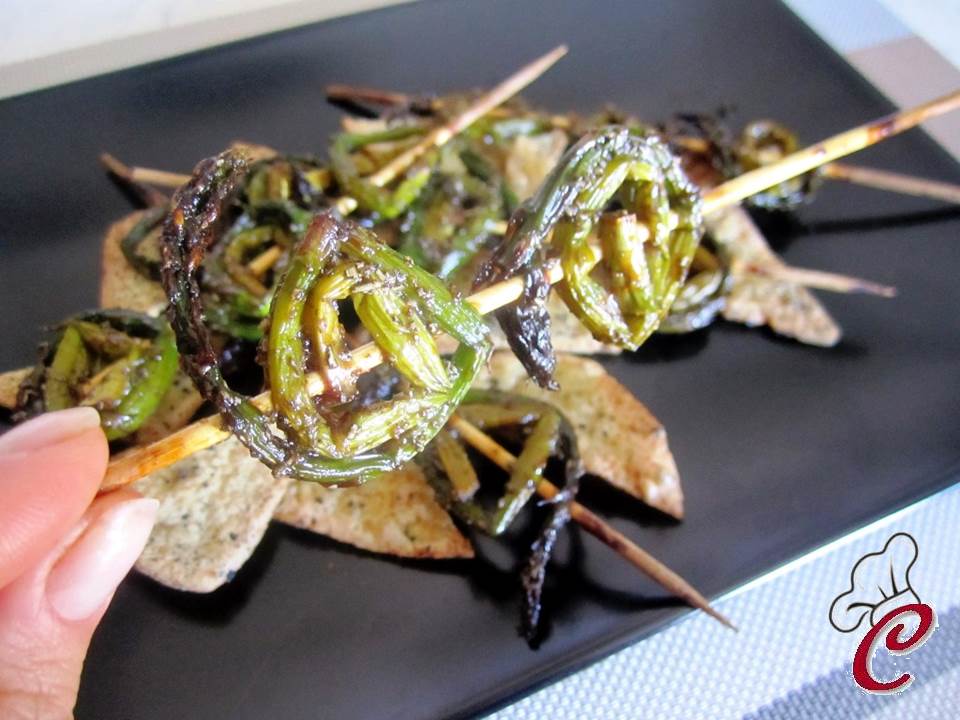 Vi capita mai di desiderare un ortaggio in una forma differente? Abituati a cucinare le carote in un modo, le patate in un altro, gli spinaci in un altro ancora, arriva il momento in cui la forma determina il sapore. Ma se con ortaggi come patate, carote, spinaci, zucchine la sfida non è poi così difficile, come ce la caviamo con gli asparagi? Ecco cosa mi ha portato a questo piatto. Adoro gli asparagi e li adoro anche, semplicemente, cotti al vapore e conditi con due gocce di limone. Ma volendo pensare a qualcosa di sfizioso, ecco che ho avvertito il richiamo di una marinatura. Sapori intriganti che richiedono, però, una magia anche nella presentazione. Così ecco che, su un letto di chips di tofu ho immaginato i miei spiedini. Che poi vai a pensare di infilzare degli asparagi: se troppo spessi, non si arrotolano, se troppo fini, si sfaldano. Beh, ci ho voluto provare, testarda e caparbia come so essere e il risultato.... valutatelo voi.Rimane un piatto leggero, completo, sfizioso e versatile. Per me è stato un piatto unico, piacevole al palato per i suoi aromi e gradevole nel contrasto di consistenze. Ma sorprendentemente semplice. Una coccola a regola d'arte per chi, come me, sceglie la genuinità senza separarsi dal piacere del buono. E, per i non amanti del tofu, le possibilità rimangono comunque infinite ^_^