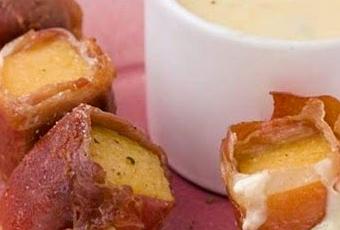 - Avvolgete ogni cubotto in un po' di prosciutto e infilzatene 4 a 4 in lunghi spiedini di legno.