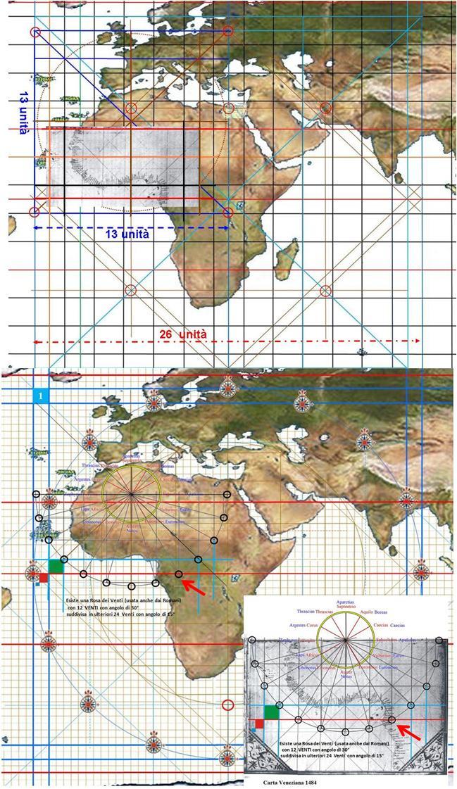 Se presento la carta del 1484, sviluppata con la rosa dei venti a 24 direzioni, posso farla combaciare su di una moderna proiezione satellitare con settori da 4,5 gradi. Trovo la stessa scala, trovo lo stesso schema da 13unità utilizzato dagli altri cartografi. Il suo schema generale da 13 dovrebbe essere la quarta parte del mio schema base che utilizza un giro di compasso da 26 unità. Qualcosa non quadra. Perché 4,5 gradi? Posso dire che, per essere una carta del 1484, è sin troppo precisa. Sono sicuro che queste carte sono copiate. Questo è un errore di lavoro. Qualcosa è sfuggito agli autori. Presentiamo lo strumento che ha permesso i miracoli cartografici del medioevo.