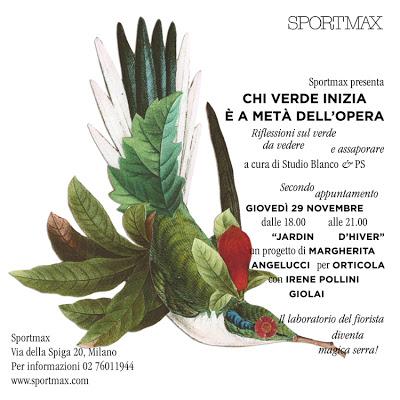 Sportmax vi invita ad una serie di appuntamenti che indagano il tema del verde nell’abbinamento tra floreale e culinario, proponendo riflessioni da vedere e assaporare che insegnino il gusto delle cose vere e buone, del tempo che scorre, dell’amore nascosto dietro ai gesti, del sapere e della gioia che c'è dietro al "fare".