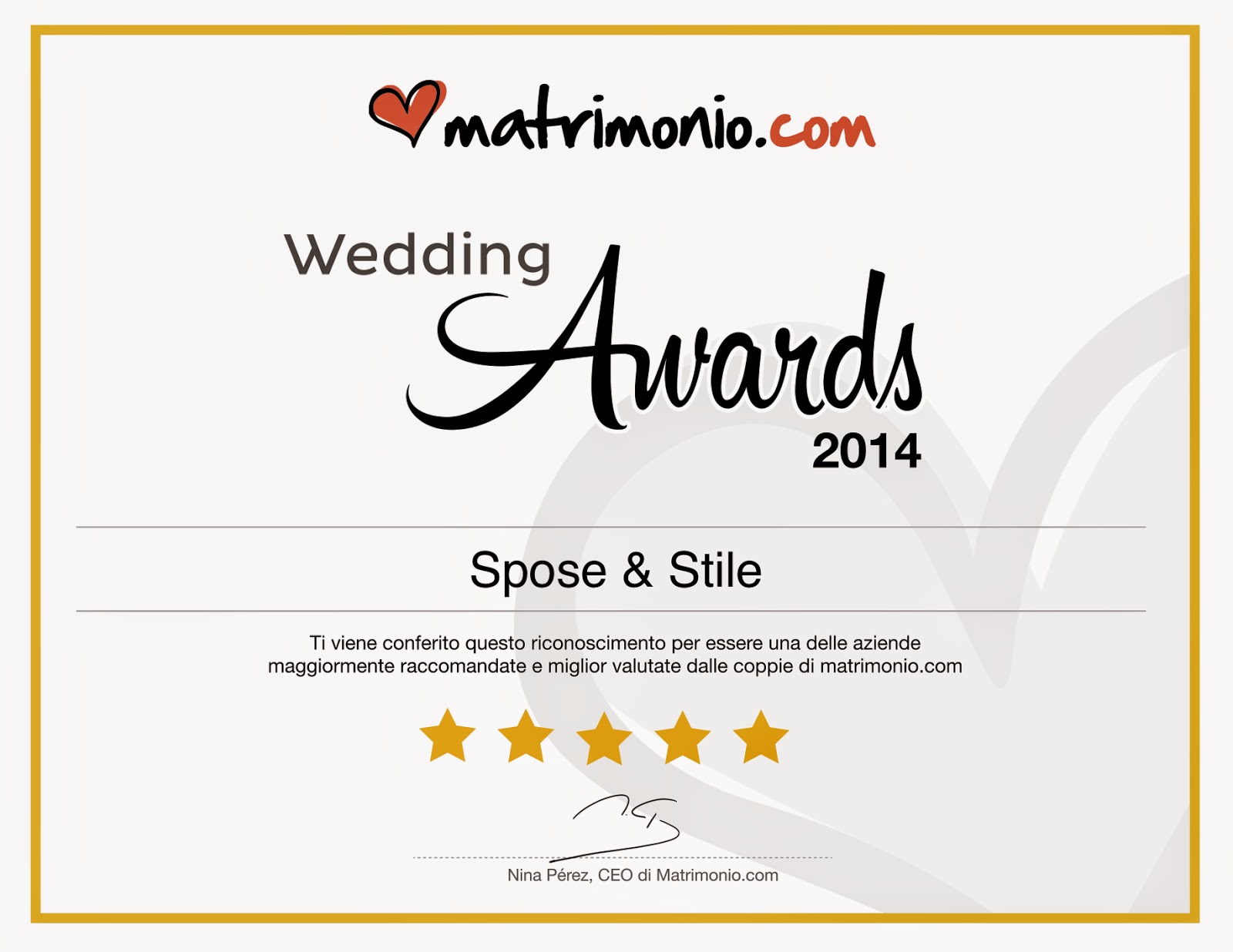 22-05-2014 | Un nuovo riconoscimento si aggiunge ai successi dell'atelier SPOSE & STILE di Bergamo!Matrimonio.com, società internazionale e portale web di riferimento dedicato alle nozze, nel mese di maggio ha attribuito ai fornitori di tutta Italia più qualificati i Wedding Awards 2014.