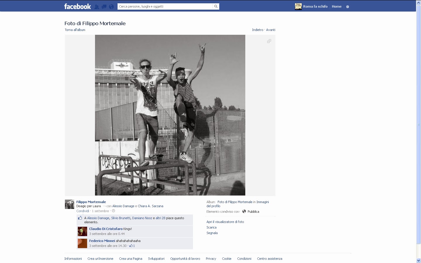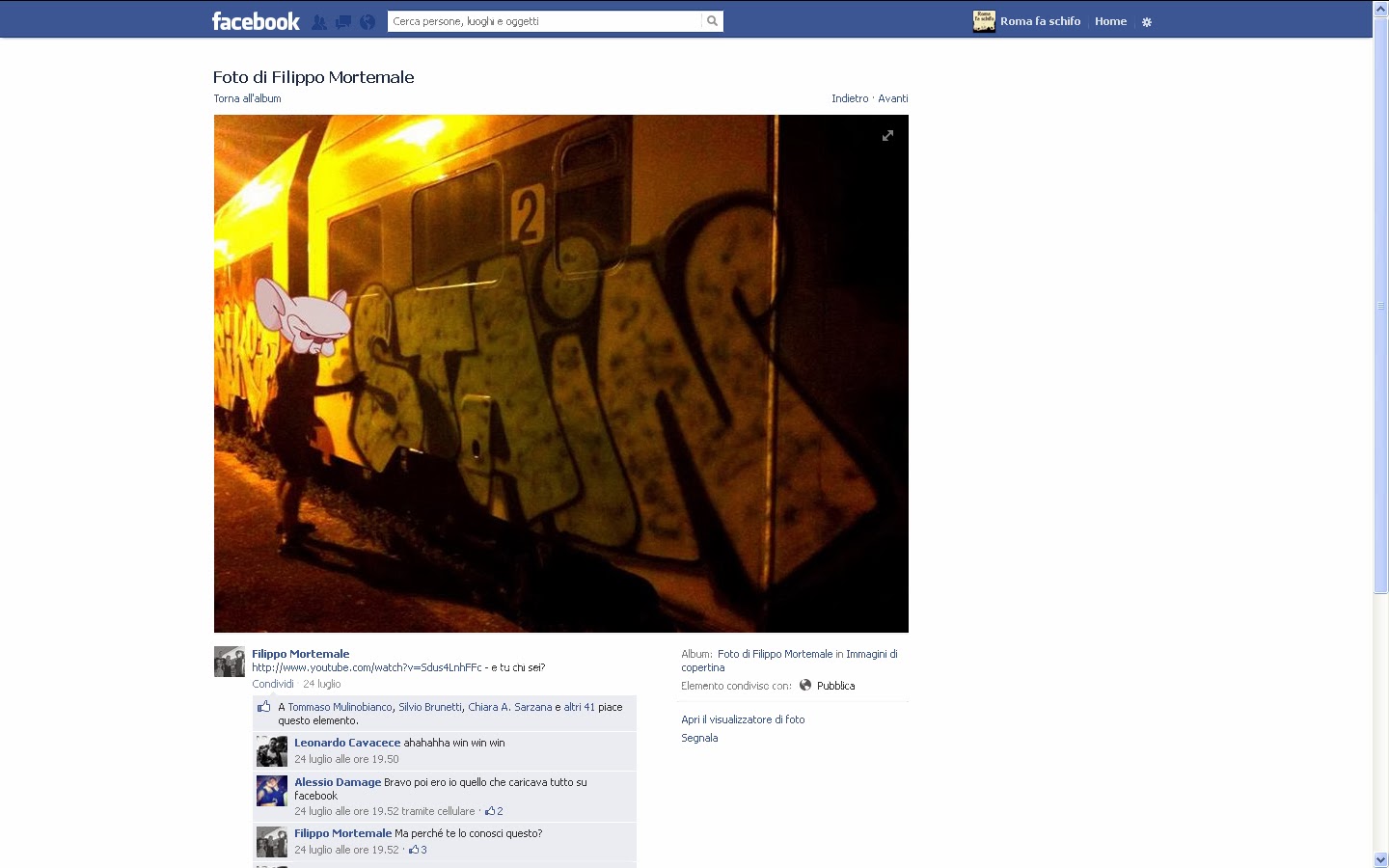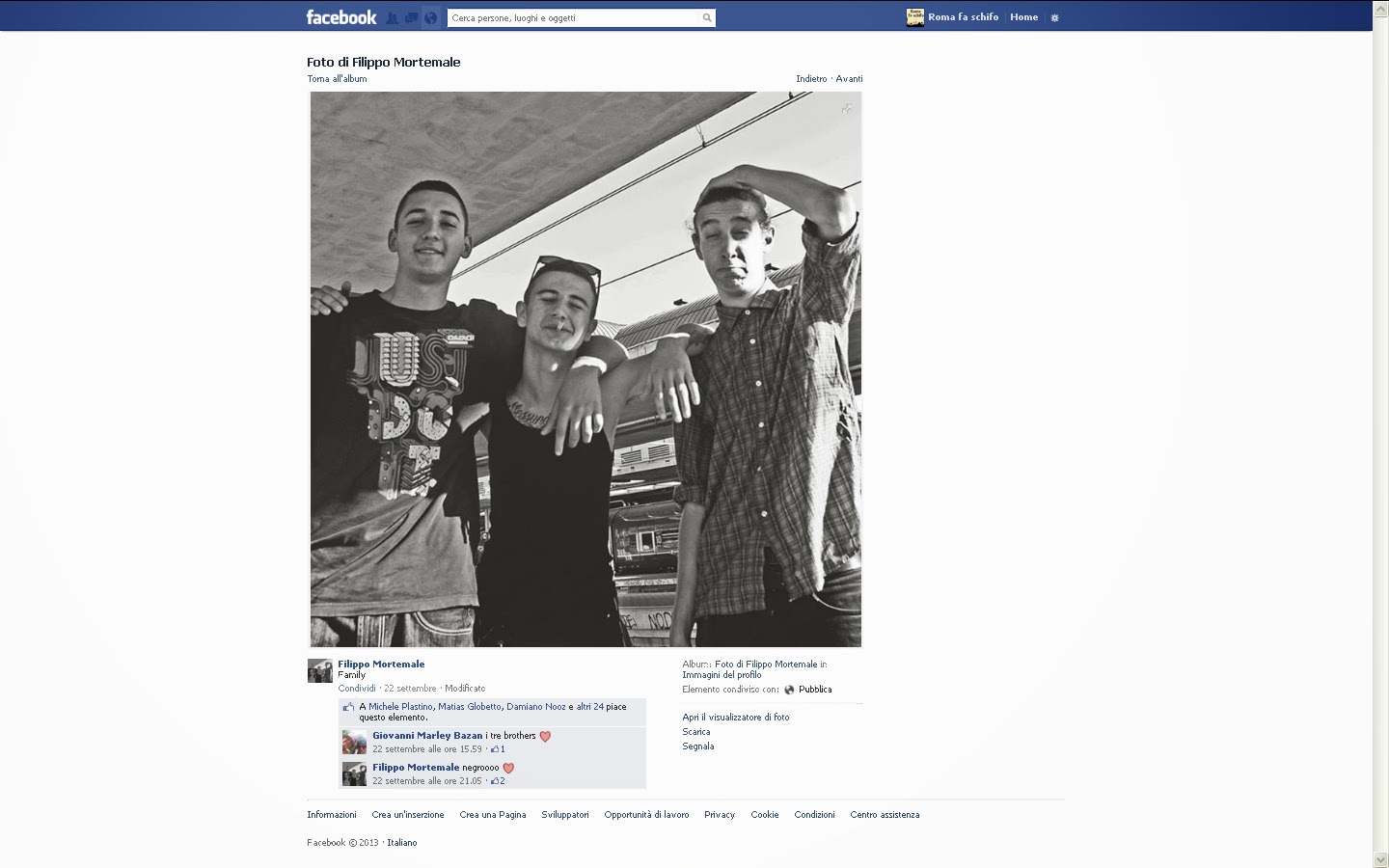 http://www.facebook.com/photo.php?fbid=471217369617992 Foto pubblica al 24/10/2013Filippo Mortemale (STAIN / STEIN) commenta: Vorrei insinuà che m'hai rotto er cazzo de fa passà ogni sforzo che faccio per merito tuo come se fossi un coglione che non se sa fa du metro. Sto più in campana de te e a differenza tua riesco a capire quando è si e quando è no. Il fatto che lo faccio con te non è perché altrimenti non posso, ma per tanti altri motivi che conosci bene, quindi te ripeto: falla finita.