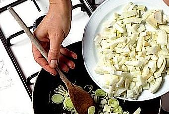 Inizio tagliando il porro a pezzettini, che passo in padella con l'olio ben caldo,l'aglio svestito e un pizzico di sale.