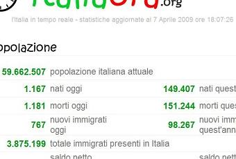 - Popolazione: il numero totale degli Italiani, i nati oggi e nel corso dell'anno, i deceduti oggi e nel corso dell'anno, gli immigrati in totale, quelli giunti oggi e da inizio anno, i saldi netti.