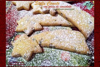 Questi deliziosi biscotti a forma di stella cometa sono buonissimi: una frolla senza lattosio e senza glutine, preparata con il mio burro vegetale e con farina di mais e farina di riso, e gocce di cioccolato fondente senza lattosio e senza glutine. Leggeri, friabili e golosi, perfetti per la colazione del giorno di Natale, inzuppati in una calda tazza di latte e cioccolato o in un buon thè.