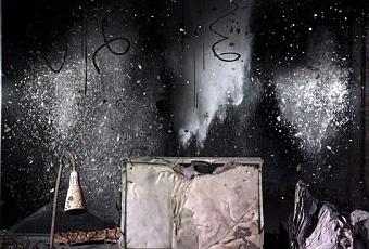 Il lightbox cattura l’attenzione, prepotente. L’impatto creato è notevole, e sottolinea una delle immagini più cruente del filmato: una scrivania, una sedia, una lampada. E poi un computer, completamente deformato dal fuoco. Tutto in ordine, eppure tutto distrutto. Il tempo che si è fermato a quella notte, in uno sprazzo di quotidianità.