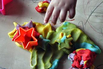 Ingredienti: 2 tazze di farina, 2 tazze di acqua calda, 1 tazza di sale, 2 cucchiai di olio vegetale, coloranti per alimenti. Procedimento: ponete tutti gli ingredienti in un tegame e mescolate a fuoco basso, lasciando che l’impasto di rassodi piano piano. Togliete dal fuoco e lasciate raffreddare. Dovrà risultare un impasto asciutto e non appiccicoso: se l'impasto dovesse essere troppo molle, continuate la cottura. Una volta ottenuta la consistenza ottimale, si possono aggiungere i coloranti e dividere l’impasto in piccole porzioni che potranno poi essere modellate a piacimento. Attenzione ad evitare che la pasta così prodotta possa essere ingerita da animali o bambini molto piccoli.