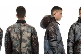 La collezione Stone Island presenta anche un parka coda di rondine in David TC. Da un iniziale substrato di poliestere/poliammide a sezione stellare, i capi in David-TC sono assemblati e poi simultaneamente tinti e trattati con un agente anti goccia.