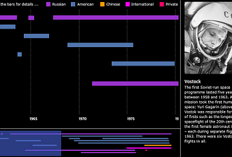 Da Gagarin allo Space Shuttle, così s'intitola questa cronologia interattiva del Guardian.Si parte dal 1961, anno del primo volo del pioniere Jurij Gagarin fino ai giorni nostri. Nella cronologia sono evidenziati anche i paesi protagonisti del volo spaziale, e cioè Russia, America, Cina, gruppo Internazionale e i gruppi privati. Per ogni anno e ogni evento c'è una scheda con i principali protagonisti.Cliccate sull'immagine per accedere alla cronologia interattiva.