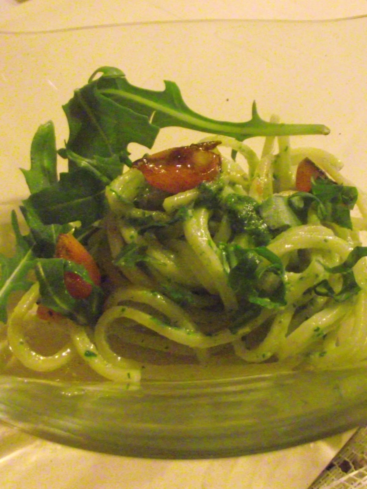 Spaghetti alla chitarra con pesto di rucola e pomodorini,secondo la ricetta de "Le 7 cannelle" di Tuscania,trovata nel libro di C.cambi "le migliori osterie italiane".Un buon piatto,allegro e particolare.