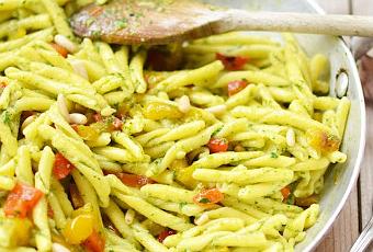 Cuocete la pasta in abbondante acqua salata: da quando gli strozzapreti verranno a galla contate un paio di minuti,scolatela e condite con il pesto di rucola e guarnite con i pinoli rimasti tritati grossolanamente.