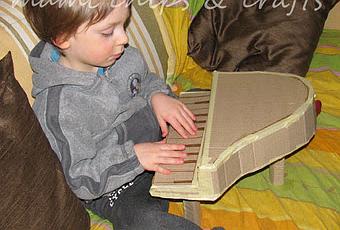 continua la produzione di strumenti cartone...siamo passati dalle chitarre ad una vera e propria banda: trombe, tromboni, corni, sassofoni, cornetti... un organo, un violoncello, un contrabbasso e un pianoforte che vede sopra (non so se i tasti siano giusti...mia nonna chissà cosa mi direbbe ;-)...ma sarebbe siuramente felice della passione del monello).