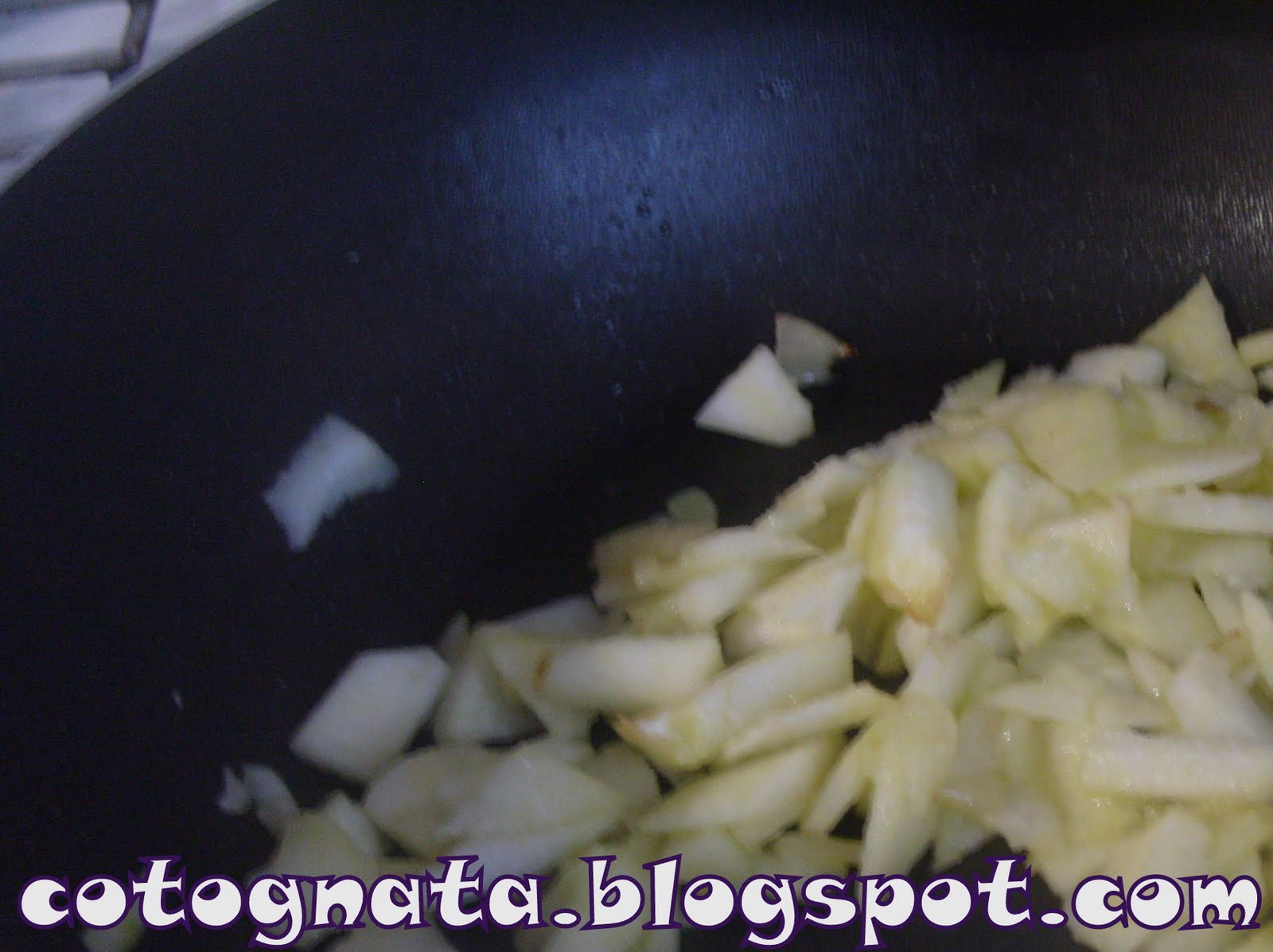 Nel frattempo prendete una padella a fondo alto e mettete a rosolare della cipolla tagliata sottilissima con un goccio di olio.