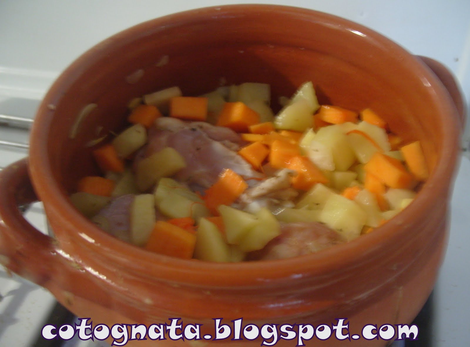 Prima di cuocere nella pentola di coccio conviene che la inumidite bene in modo tale che non ci siano problemi durante la cottura. Ci versate dentro un pò di olio e della cipolla tagliata fine. Aggiungete poi a far rosolare i pezzi di pollo che avete prima messo a macerare in un battuto di timo, origano, sale iodato e vino rosso . Una volta girati da una parte e dall'altra, aggiungete i tocchetti di patate che avete già tagliato e dopo qualche minuto i pezzetti di zucca gialla. Aggiungere un pizzico di sale un rametto di origano e 2 foglie di alloro.