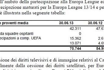Peraltro nel bilancio la Società non ha fornito una precisa ripartizione di valori, quindi non è possiible comprendere se i 2,648 milioni di Euro indicati come provenienti dala "partecipazione alla Coppa Italia" riguardino solo i ricavi maturati fino al 30 giugno (cioè per le partite effettivamente disputate), ovvero contengano all'interno anche una quota dei proventi (pari a 1,831 milioni di Euro) che il Consiglio di Lega del giugno 2013 aveva deciso di assegnare alla Lazio.