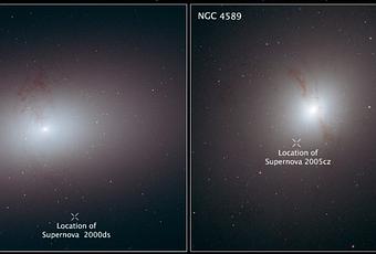 Queste immagini di Hubble mostrano due galassie ellittiche in cui si notano delle righe di polvere scure che rappresentano una chiara evidenza di un recente merger galattico. La polvere è l’unico prodotto residuo di una galassia più piccola che è stata consumata da una galassia ellittica più grande. La “X” indica la posizione delle supernovae che sono associate alle galassie. Queste supernovae vagabonde sono posizionate a diverse distanze dalle rispettive galassie: in questi due casi, SN 2000ds (a sinistra) si trova ad almeno 12.000 anni luce da NGC 2768, che dista 75 milioni di anni luce; SN 2005cz (a destra) si trova a circa 7.000 anni luce da NGC 4589, che dista 108 milioni di anni luce. Entrambe le galassie sono state osservate con la Advanced Camera for Surveys a bordo del telescopio spaziale Hubble. In particolare NGC 4589 è stata ripresa nel 2006 e NGC 2768 nel 2002. Credit: NASA, ESA, e R. Foley (University of Illinois)
