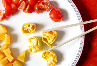 Grattuggiare le carote e condire con un filo di olio e sale. Disporre carote e pezzetti di formaggio o tofu e arrotolare bene la frittata.