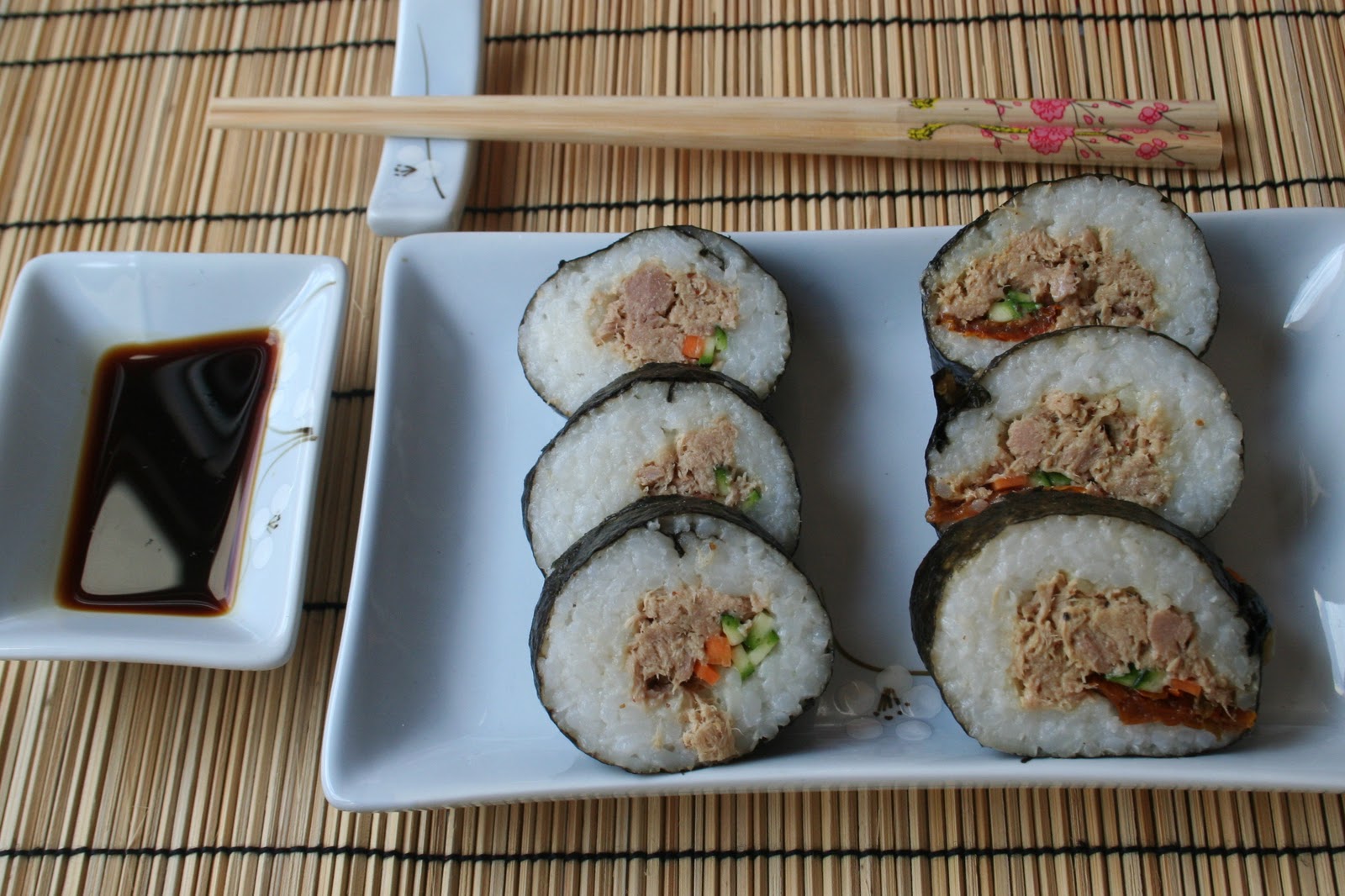 Cominciamo dal riso, è un riso dal chicco tondo che contiene molto amido e che quindi diventa parecchio colloso, cosa che in questo caso non rappresenta un difetto, deve essere lavato prima di essere cotto, io lo metto in un colino è lo passo sotto l'acqua corrente fino a che l'acqua che corre via non è completamente limpida, una volta lavato va messo a cuocere in un pentolino partendo da acqua fredda con una proporzione di 1:1/2, quindi con una tazza di riso va messa una tazza e mezza di acqua fredda, impostate in fornello al minimo e calcolate più o meno venti minuti...durante i quali non dovrete toccare nè il riso, nè la pentola...l'unica accortezza una volta spiccato il bollore sarà quella di incoperchiare. Trascorso il tempo di cottura il riso avrà assorbito tutta l'acqua, lasciarlo coperto per altri 8/10 minuti, quindi con i rebbi di una forchetta sgranarlo e condirlo con i due cocchiai di condimento...mi raccomando niente sale! Mentre il riso si raffredda occupiamoci del ripieno...ho sgocciolato il tonno premendolo leggermente contro le pareti del colino per far uscire tutta l'acqua, l'ho trasferito in una ciotolina e l'ho condito con tre cucchiai di senape, del pepe nero e un pizzichino di sale, ho dato una bella mescolata e l'ho lasciato riposare. Ho pelato la carota, spuntato la zucchina e ne ho ricavato solo la parte verde scartando tutta la parte che contiene acqua e semi, poi ne ho fatto una julienne...ora entriamo nel vivo!! Se come me avete il tappetino per arrotolare il sushi usatelo...altrimenti potete usare della pellicola, su cui dovete poggiare il foglio di alga, sul foglio d'alga va steso il riso, compattandolo per benino e lasciano un bordo di 2/3 centimetri, poi sul lato più vicino a voi stendere uno strato di tonno, qualche bastoncino di zucchina e di carota e arrotolate aiutandovi con la stuoietta, cercando di stringerlo il più possibile....attenzione...qui bisogna essere decisi, ma delicati perchè il foglio di alga si può rompere! Una volta chiuso va ulteriormente arrotolato in un foglio di pellicola, formando una caramella e, tenendo ben salde le estremità, farlo rotolare più volte così da stringerlo per bene e far uscire tutta l'aria. Queste caramelle di sushi devono riposare in frigo per almeno 30 minuti. Non ci resta che magiare adesso....ops....non prima di averlo tagliato con un coltello ben affilato...io lo accompagno con la salsa di soia perchè mi piace molto, ma anche una classicissssima salsa verde con questo susci forse non ci starebbe troppo male!!