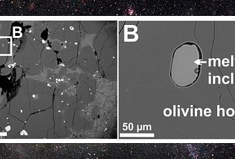 Immagine ottenuta con un microscopio elettronico a scansione di una picrite dell’Isola di Baffin, un tipo di roccia basaltica. Il minerale olivina, qui mostrato a sinistra nella figura A, ospita una serie di inclusioni fuse di vetro che contengono minuscole quantità di acqua la cui origine proviene dalle parti profonde del mantello terrestre (figura B). Credit: Lydia J. Hallis