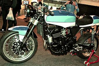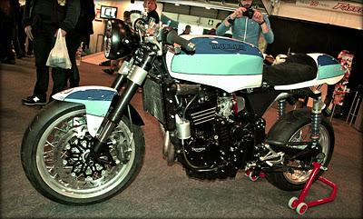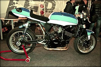 La parte posteriore della moto è stata interamente trasformata in modo da installare, in luogo del mono originale, una coppia di ammortizzatori laterali e permettere un nuovo percorso al collettore di scarico, che termina ora con un compatto silenziatore in titanio e carbonio all’interno del codone, di derivazione Thruxton Cup. L’avantreno arriva da una più recente Speed Triple 1050: forcelle a steli rovesciati, pinze radiali, e dischi wave. Una special molto raffinata (persino troppo, per i miei gusti rustici) e direi più racing che non cafè oriented…