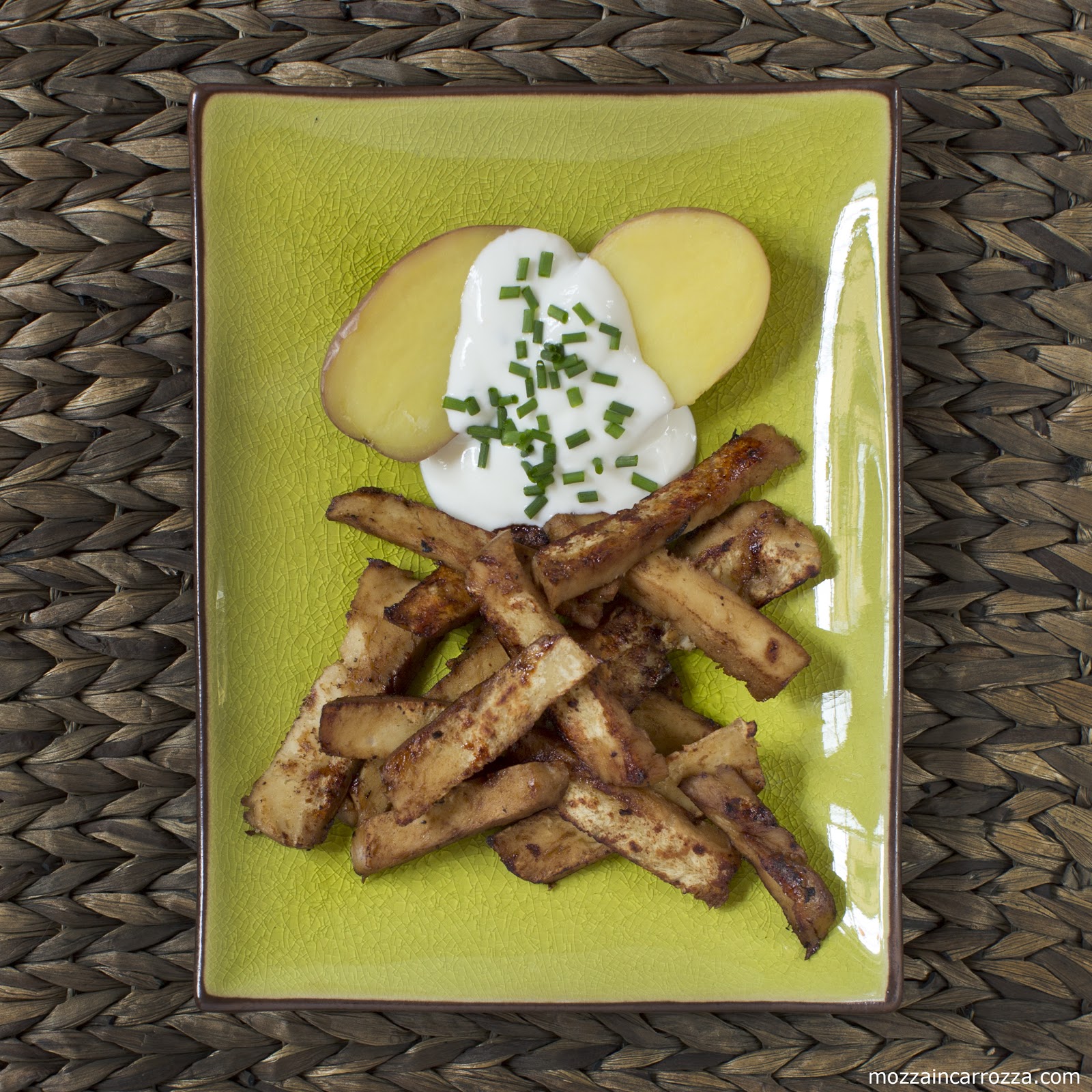Cuocere le patate al cartoccio (o in pentola a pressione). Preparate intanto la salsa: in una ciotola unite la maionese, lo yogurt, l’aglio. Grattugiate un pò di zenzero pelato e unitelo agli altri ingredienti. Aggiustate di sale e per ultimo tagliate l’erba cipollina finemente e aggiungetela nella ciotola. Mescolate bene. Tagliate a straccetti il seitan e scottarlo in una padella antiaderente molto calda aggiungendoci 2 cucchiai circa di salsa di soia, finche non raggiunge una consistenza croccante. Servire con le patate tagliate a metà e abbondante salsa allo yogurt.