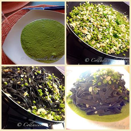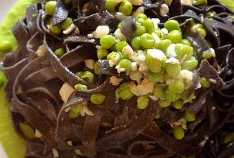 Inpiattate costruendo il piatto con alla base la salsa di pisellini e sopra adagiate le tagliatelle al nero con orata e piselli.