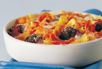 - Passate tutto al mixer e con il composto ottenuto fate delle palline, infarinatele e friggetele in olio bollente. Lessate le tagliatelle in abbondante acqua salata, scolatele al dente, distribuitele in una pirofila a strati alternandole con altri di mozzarella a dadini, salsa di pomodoro, palline di carne e pecorino grattugiato fino a esaurimento degli ingredienti.