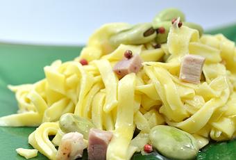 Cuciniamo insieme:Prepariamo le crespelle. Mescolate con la frusta in una terrina la farina con le uova, aggiungete il sale e lentamente il latte creando un impasto omogeneo. Scaldate nel frattempo una padella antiaderente e versate un mestolo scarso di impasto inclinando la padella come per fare le crepes fino a doratura da entrambi i lati. Mettete le crespelle da parte e nella stessa padella prepariamo il condimento: in un po' d'olio, aggiungete lo spicchio d'aglio e le fave fresche . Dopo qualche minuto minuti aggiungete lo speck cotto a dadini e qualche grano di pepe rosa. Infine fate saltare la pasta di crepes che avrete ottenuto arrotolando insieme tutte le crepes e tagliandole a listarelle. Se occorre aggiustate di sale.