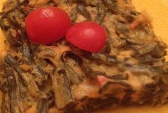 Dunque, questi tagliolini al nero di seppia al forno con un delicato sugo di carciofi e polpa di granchio, anziché con la raffinata denominazione del titolo, da noi li battezzeremmo semplicemente “pasticcio di lasagnette nere”.
