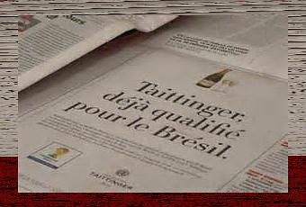 La bevanda officiale della coppa del mondo 2014 in Brasile è Taittinger. La FIFA voleva uno champagne distribuito mondialmente , con un nome famoso in modo da rispondere ai bisogni di un evento importante come è la coppa del mondo, specie se si svolge in mercati molto interessanti come quello brasiliano. Taittinger ha risposto presente; non ha creato una cuvee speciale per celebrare ma ha solamente cambiato le etichette del Brut reserve: una specie di effetto tridimensionale con i palloni del calcio o futebol. Taiitinger ha iniziato a sfruttare l’immagine dello sponsorship con una serie di campagne pubblicitarie legate al campionato. Singapore, Germania,Cina, USA etc etc sono i paesi dove la pubblicità effervescente è più sentita.