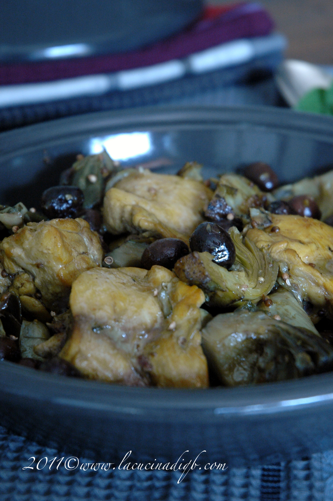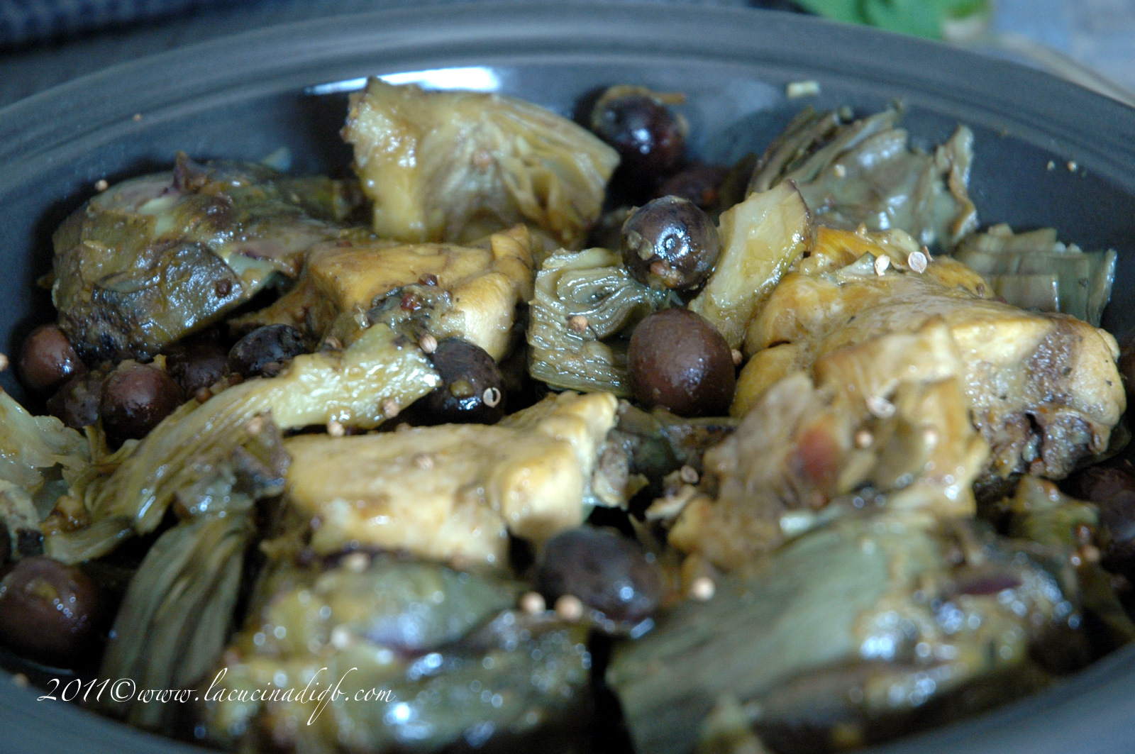 Forse la Zia avrebbe guardato con sospetto questo piatto, una Tajine, ma se le avessi detto "guarda che si tratta di un pollo con i carciofi" l'avrebbe sicuramente gradito!Tajine di pollo profumato con carciofi e oliveIngredientiUn pollo (se riusciste a procurarvelo da qualche contadino....), 8 piccoli carciofi o "castraure", 1 spicchio d'aglio, 2 cipollotti, 2 cucchiai di olive nere (del mio albero!), 1 limone non trattato, 1 cucchiaio di semi di coriandolo, 2 cucchiai di basilico fresco tritato (o menta, se preferite), sale, pepe di mulinello, olio evo, brodo vegetale o di pollo.ProcedimentoMondare i carciofi, ridurre i gambi e tagliarli in 4 spicchi mettendoli in una ciotola di vetro con acqua acidulata dall'acqua del limone.Nella tajine rosolare i pezzi di pollo per 5', unire lo spicchio d'aglio e i cipollotti tritati, unire il brodo fino a coprire per 2/3, coprire e cucinare per 30' a fuoco medio.Dopo questo periodo, unire i carciofi, le olive bucherellate con i rebbi di una forchetta, i semi di coriandolo, profumare con una macinata di pepe e regolare di sale. Cucinare coperto per altri 20'.Unire il basilico tritato e la scorza di limone grattugiata con la microplane, mescolare e cucinare per altri 2-3'.Servire con un po' riso pilaf o del couscous profumato con una macinata di semi di coriandolo.