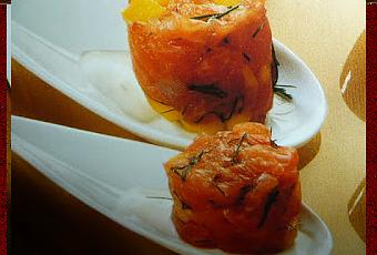 tritate il tonno con un coltello unitevi un ciuffo di finocchietto tritato i mango a dadini minuscoli pelate un pezzo di zenzero grattugiatelo e raccogliete la polpa in un pezzo di carta da cucina spremetene il succo condite il salmone con parte del succo e pepe bianco