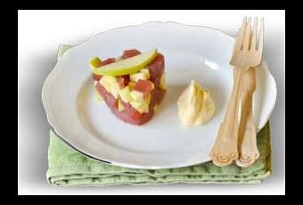 Tagliate il tonno a cubetti piccoli, cercando di farli tutti della stessa dimensione. Lavate bene la mela, asciugatela e tagliatela a tocchetti, tenendo da parte 4 piccole fettine. Mettete il tonno e la mela in una ciotola, condite con olio, sale e pepe. Riempite 4 coppapasta con la tartare e servite con una quenelle di Legeresse decorata con