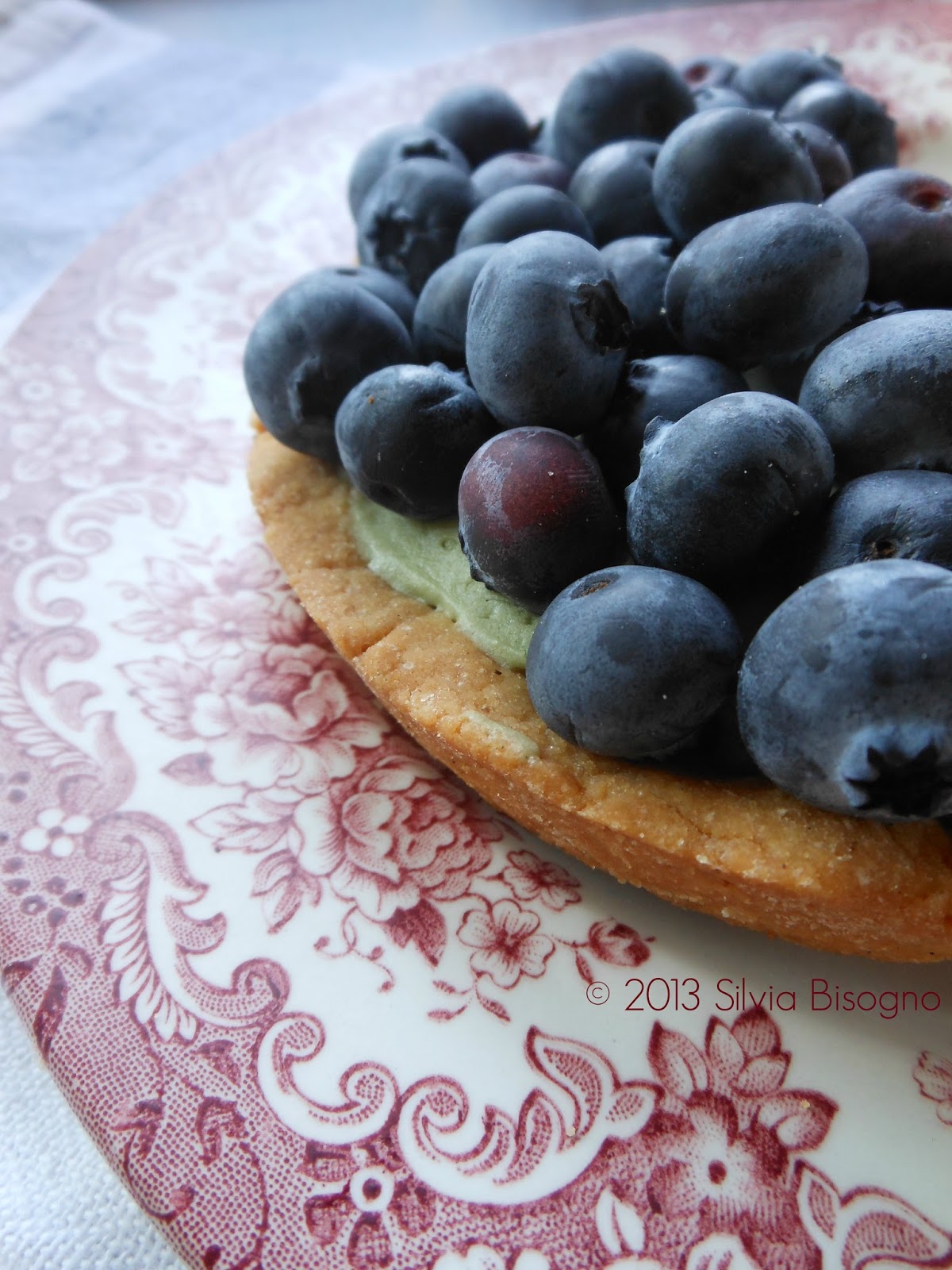 Lasciar ammorbidire il burro a temperatura ambiente.Passare la farina a setaccio e formare su una spianatoia una fontana,mettere nel centro lo zucchero e i tuorli,la buccia di limone e la polpa di vaniglia;miscelare i tuorli con lo zucchero senza prendere la farina,quando si è creata una pastella inserire il burro,schiacciare fra le mani x amalgamare il tutto,unire così la farina a poco a poco,sfregando mano contro mano fino ad inumidire la pasta e cominciare ad impastare nella maniera classica.mettere l'impasto nella carta forno e schiacciarlo,facendolo diventare sottile,chiudere bene il pacchetto e riporre in frigo per almeno 1,30 minuti oppure in congelatore 10 minuti.Quando si riprende la pasta per utilizzarla,lavorarla con le mani e un pò di farina per renderla di nuovo plastica. Foderare una teglia unta di burro e bucare il fondo, cuocere con un peso per 15 minuti a 180°C e senza per altri 15. Lasciar raffreddare.Per la ganache:spezzettare il cioccolato e farlo fondere lentamente al microonde, intanto scaldare i 110gr di panna e portarli a bollore.Versarli in 3/3 sul cioccolato fuso mescolando energicamente,unire la pasta pistacchio. Lisciare con il mixer a immersione e aggiungere i 50gr di panna liquida, coprire con una pellicola e lasciar raffreddare in frigo 3 ore. Montare lentamente con le fruste la ganache ben fredda. Farcire la crostata fredda e guarnire con i mirtilli freschi.