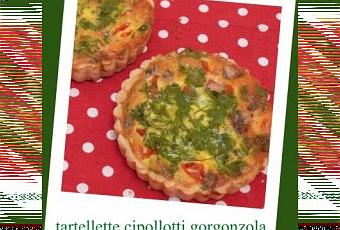 Preriscalda il forno a 200°. Fodera gli stampini con la pasta brisée e mettili in frigorifero. In una padella fai scaldate i cipollotti tagliati a fettine con un cucchiaio di olio e il timo. Aggiungi sale e pepe. Fai stufare senza far troppo colorire fino a che le verdure non sono tenere, circa 6/7 minuti. In una ciotola sbatti le uova con il latte e la panna. Aggiungi il prezzemolo tritato, la noce moscata, sale e pepe. Disponi le verdure sul fondo degli stampini, cospargi il gorgonzola e i pomodorini a pezzetti quà e là. Versa il composto di uova. Inforna per circa 25 minuti o fino a che il tutto non è cotto. Lascia riposare una decina di minuti prima di servirle. Ottime mangiate tiepide.